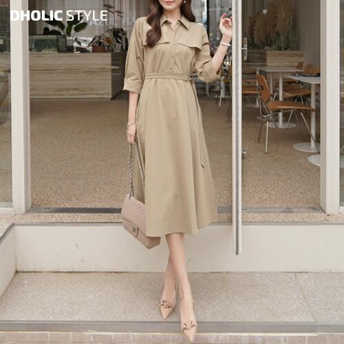 韓国ファッション ワンピース ロングワンピース ロング丈 シャツカラー 7分袖 ハーフボタン フレアワンピース Aライン ベルトスリム 無地 オフィス 夏 春 Dholic 通販 Paypayモール